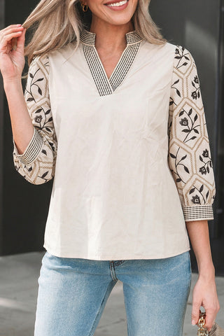 Stylish floral patchwork blouse with a contrast V neck design.