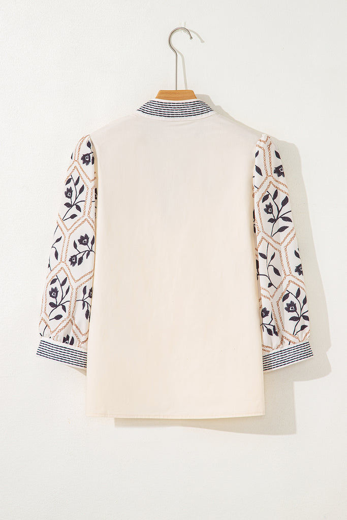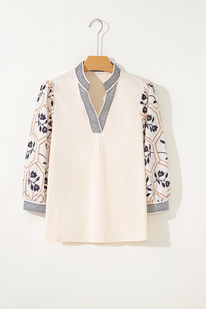 Stylish floral patchwork blouse with a contrast V neck design.